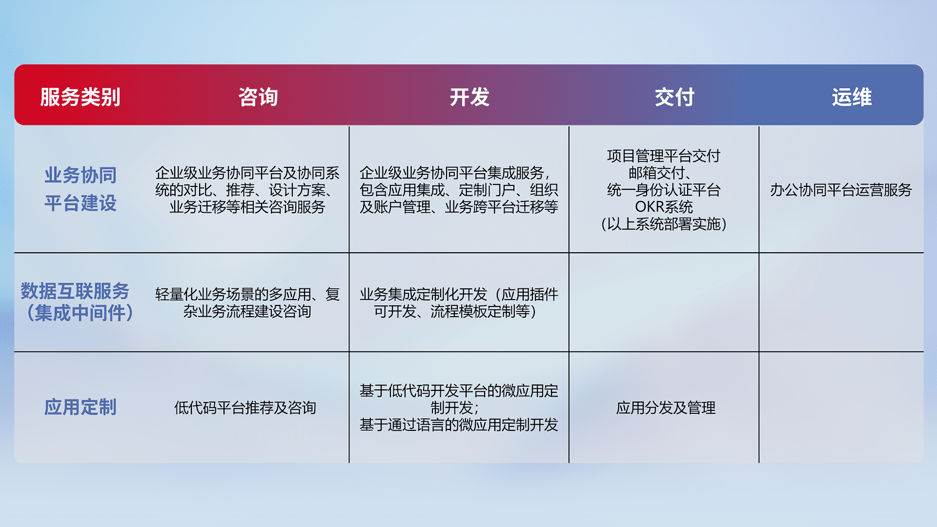 针对钉钉、、、、企微、、、、IDaas等平台级产品提供产品的规划、、方案、、、交付、、、、定制化开发等服务,,,实现如统一协同办公、、、、智能客户服务、、、、混合会议管理、、、智能数据查询、、、等业务场景,,实现数字化转型。。。。