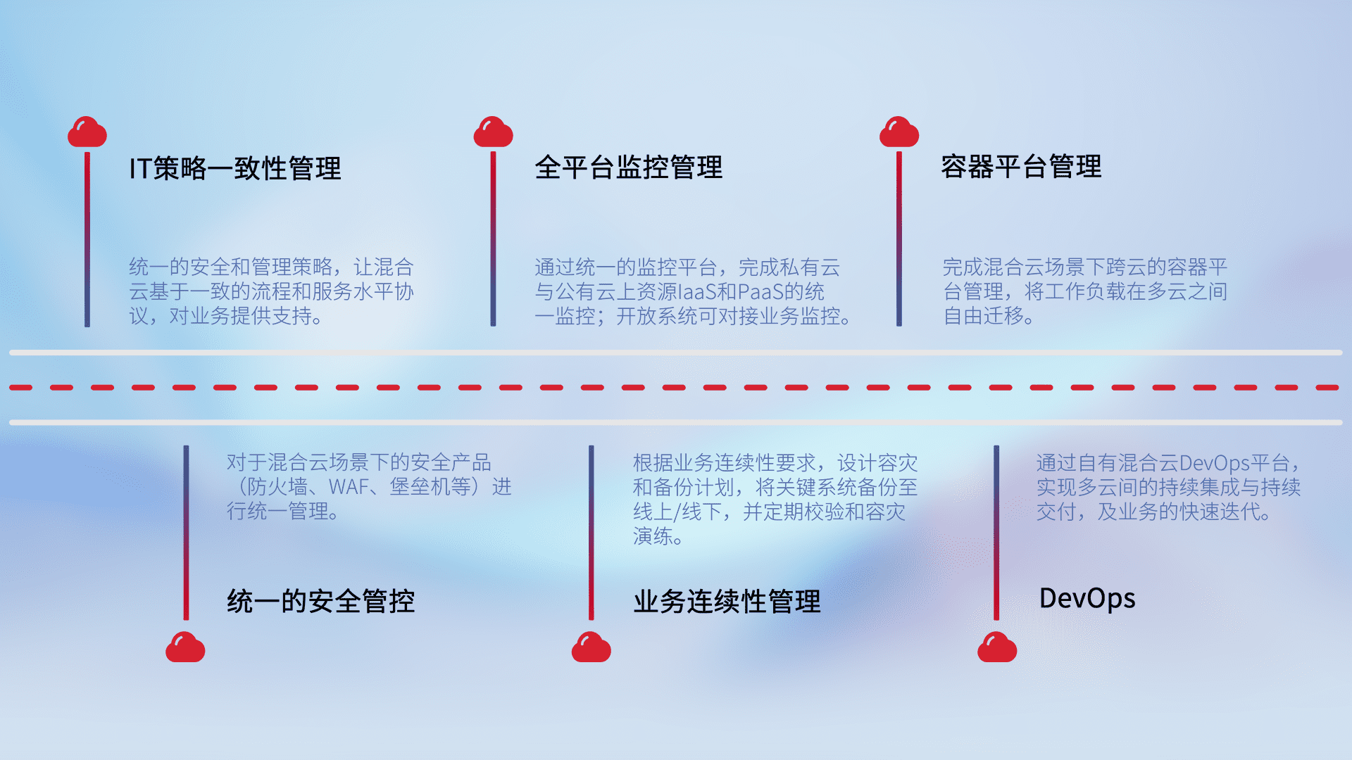 通过多云纳管,,,以统一的资源数据模型把客户的云资源进行抽象和封装,,,,进而实现对多云资源的统一操作,,保障云资源管理的可靠性、、稳定性与可用性。。量身定制化运维内容,,配置、、、开发运维、、补丁管理、、、备份、、监控、、、、认证和访问管理、、审计和日常巡检等,,,保障在用云过程中的可靠度,,,,稳定度以及高可用率。。。。